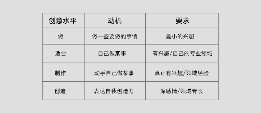 我們來看一個(gè)科學(xué)家桑德斯關(guān)于對(duì)消費(fèi)水平的研究,從典型的購(gòu)物體驗(yàn)中得到的所有東西,可以將它們分為:購(gòu)物,購(gòu)買,擁有和使用四個(gè)層次,而且,這四種層次的創(chuàng)造力,都是每天人類所需要的我們用一個(gè)表來闡述一下: